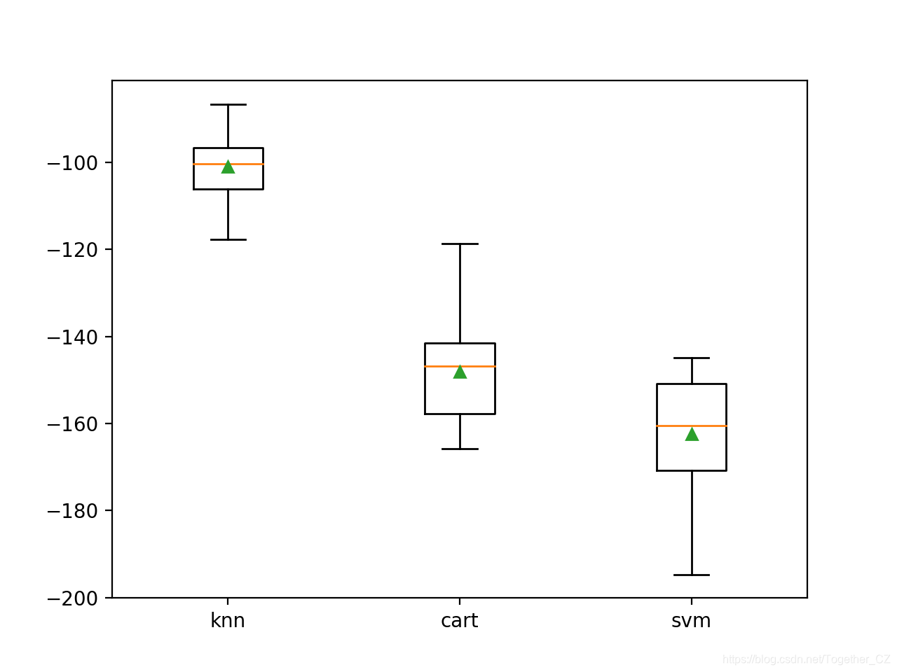 首先运行示例,报告每个模型的均值和标准差MAE。 注意:由于算法或评估程序的随机性,或者数值精度的差异,您的结果可能会有所不同。 考虑运行该示例几次并比较平均结果。 我们可以看到,在这种情况下,KNN的最佳表现为平均负MAE约为-100。