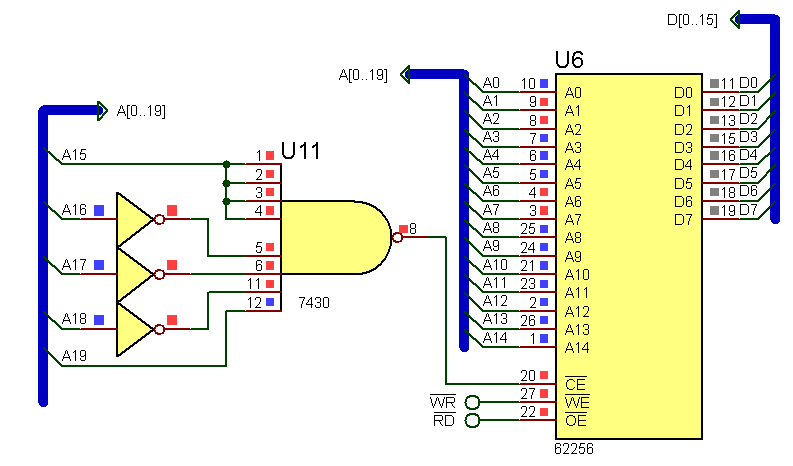(3)要使门电路输出1,则左边A15-A19经过与非门 之后输出低电位使CS*片选有效,故A15-A19的编码为10001,后面15根地址线分别全0和全1,就是SRAM 62256的地址范围。0x88000-0x8FFFF.