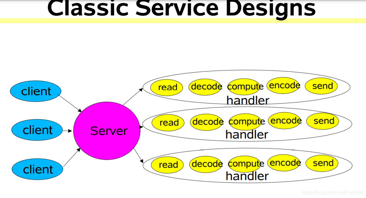 b. 如果使用线程池,可以避免a. 中提到的问题,但是由于socket 的 accept(),read()方法都是阻塞式的,会导致新进的连接和现有socket上的数据读取不及时,时间都用在等待客户端数据发送上了。效率低下