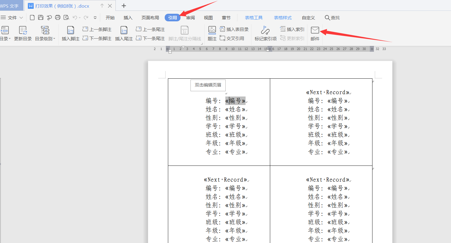 3.打开[引用]菜单,选择[邮件]图标,打开"邮件合并"功能。