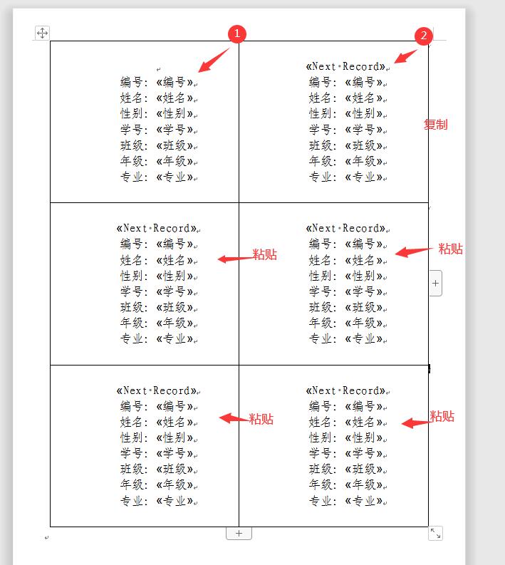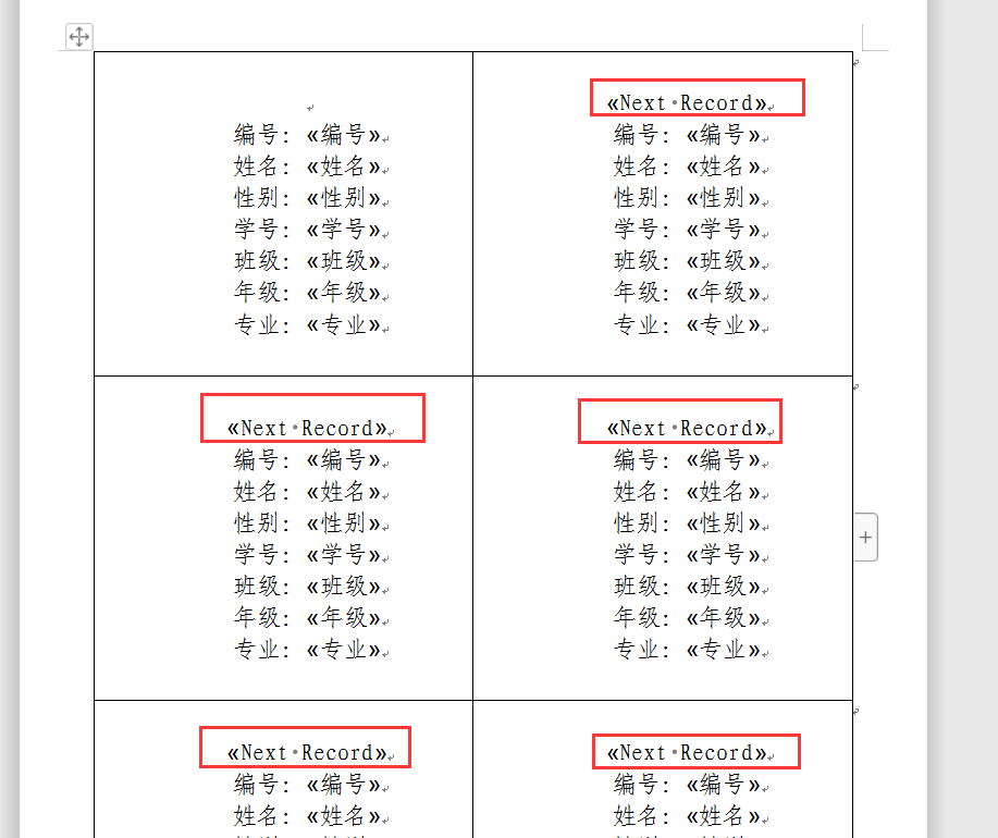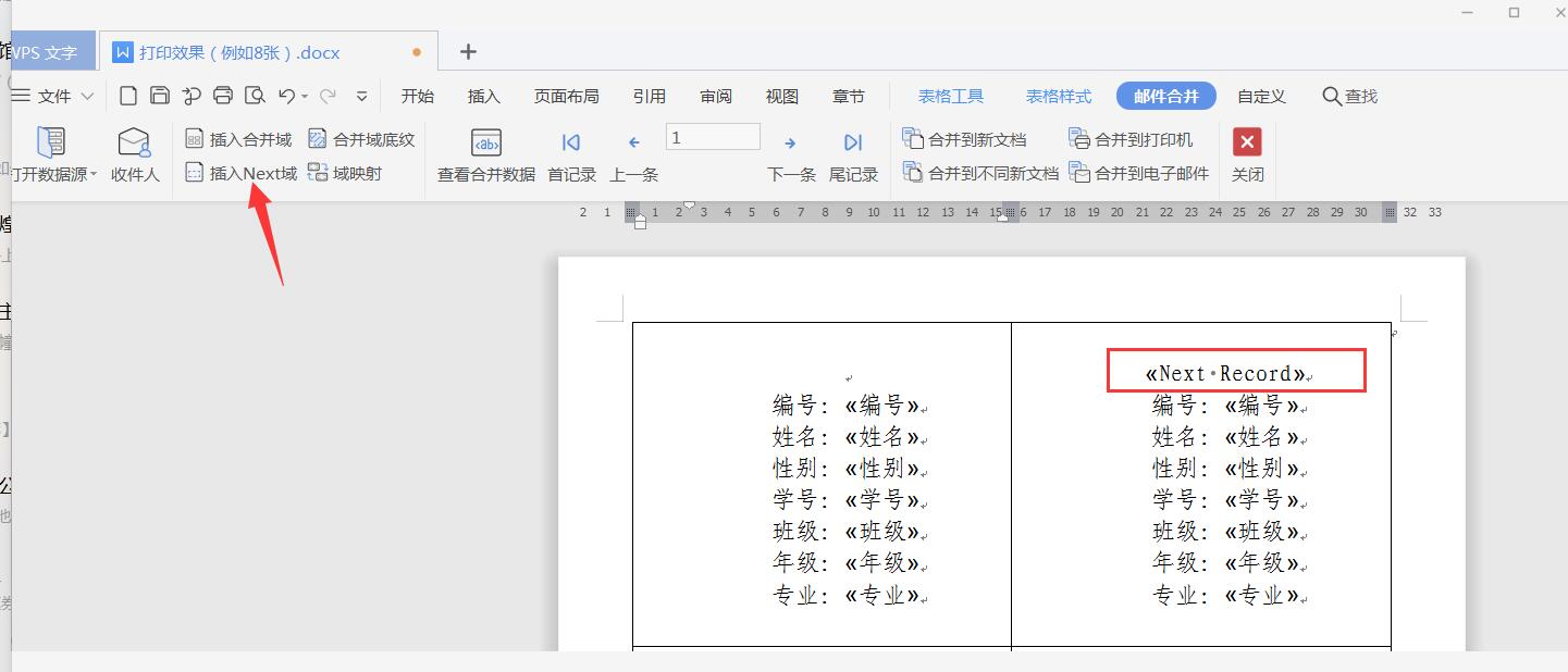 7.然后在第二个(域)之后的每个记录(域)前面点击[插入Next域]插入«Next Record»标签。