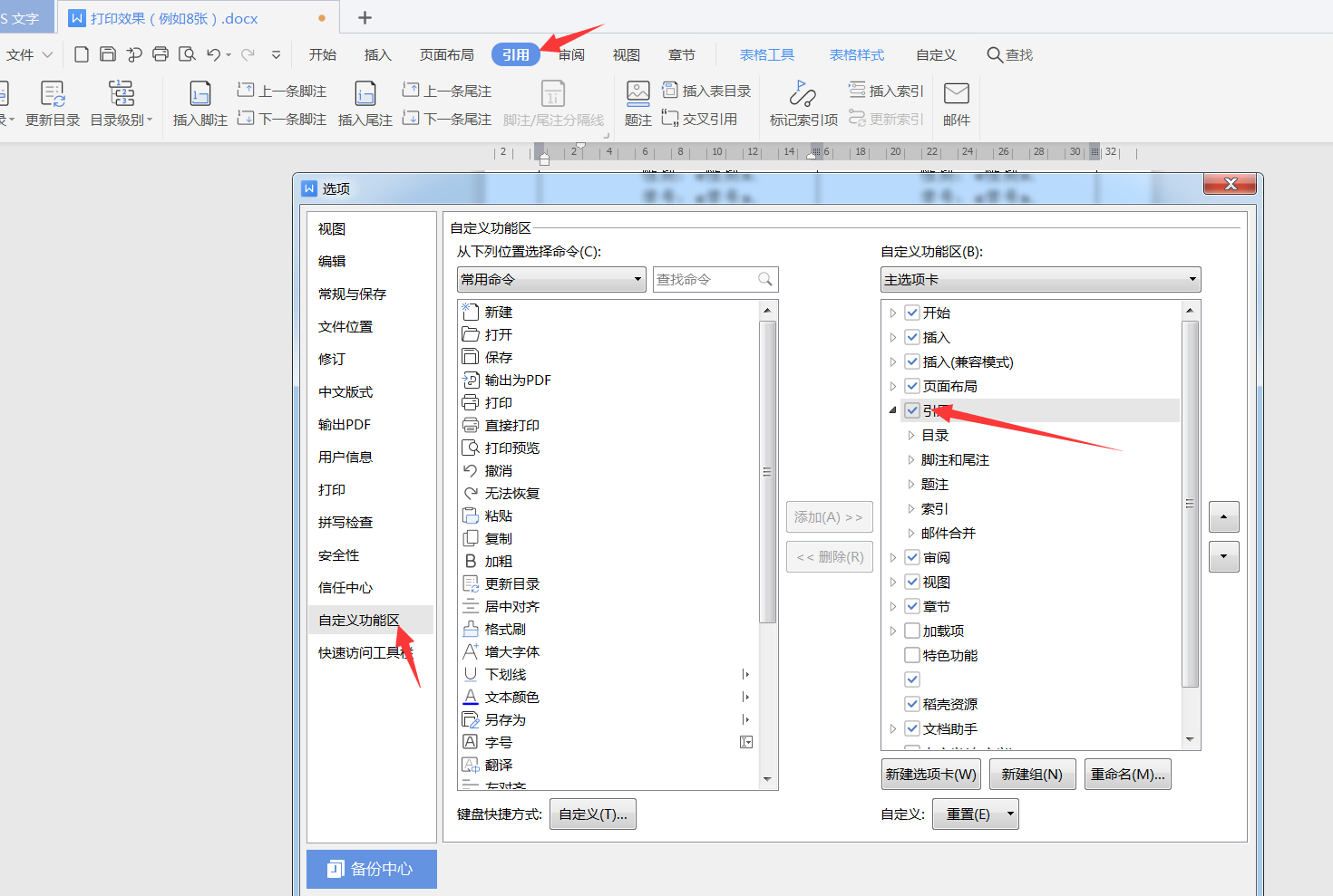 9.如果WPS的[引用]菜单不显示,可以通过[选项]的[自定义功能区]里面配置勾选显示。