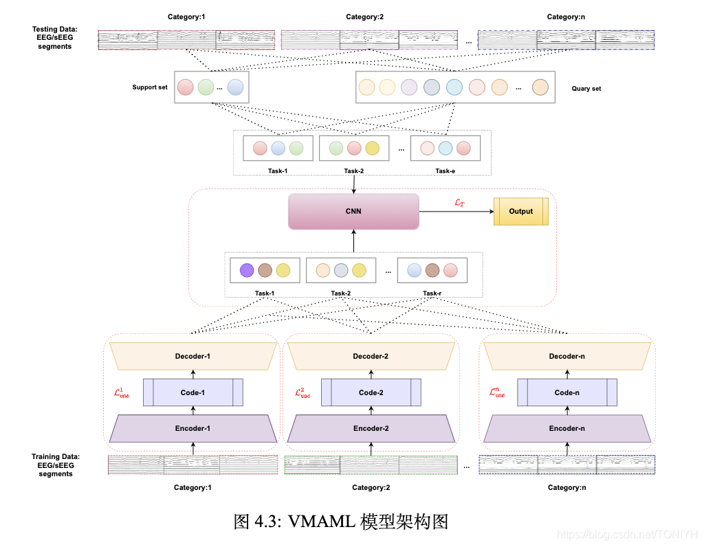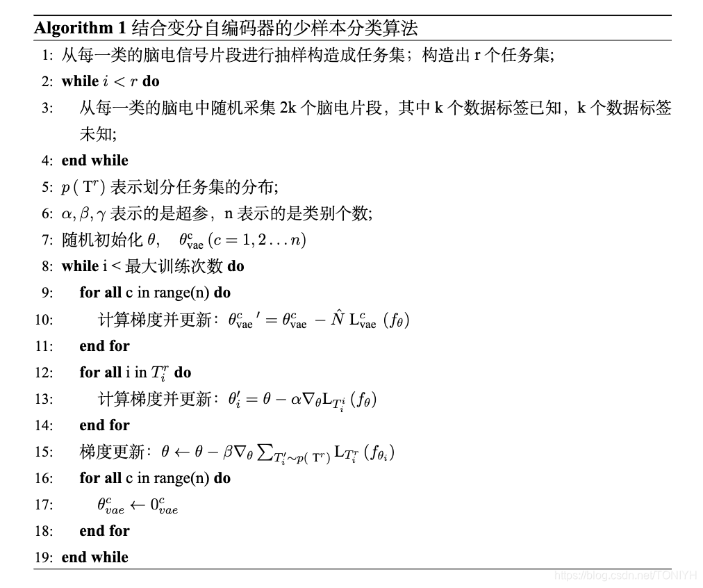 我们通过特定的方法来排列信道构成矩阵,然后通过切割矩阵来获得数据片段。这个数据片段就是模型的输入,首先对于每一类的数据可以通过VAE编解码,这样能够提取到每一类的脑电数据的特征,然后通过水机采样的方法来构建任务集。再结合MAML(Model Agnostic Meat Lrarning)来实现模型的分类,这样做的好处能够借助于变分自编码器和少样本学习提高模型的泛化能力。