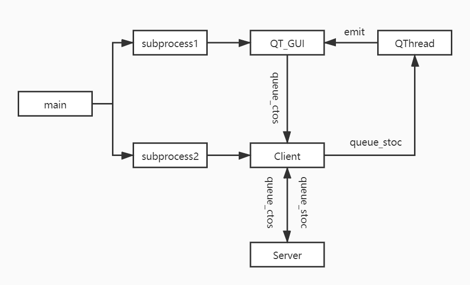 from test_ui import Ui_Formdef process1(q_ctos,q_stoc,q_ctos_cancel):app = QApplication(sys.argv)window = Ui_Form(q_ctos,q_stoc,q_ctos_cancel)window.show()app.exec()def process2(q_ctos,q_stoc,q_ctos_cancel):client = Client(q_ctos,q_stoc,q_ctos_cancel)client.main(sys.argv,"config/config.client")if __name__ == '__main__':q_ctos=Queue(maxsize=100)q_stoc=Queue(maxsize=100)q_ctos_cancel=Queue(maxsize=100)p1=Process(target=process1,args=(q_ctos,q_stoc,q_ctos_cancel))p2=Process(target=process2,args=(q_ctos,q_stoc,q_ctos_cancel))p1.start()p2.start()