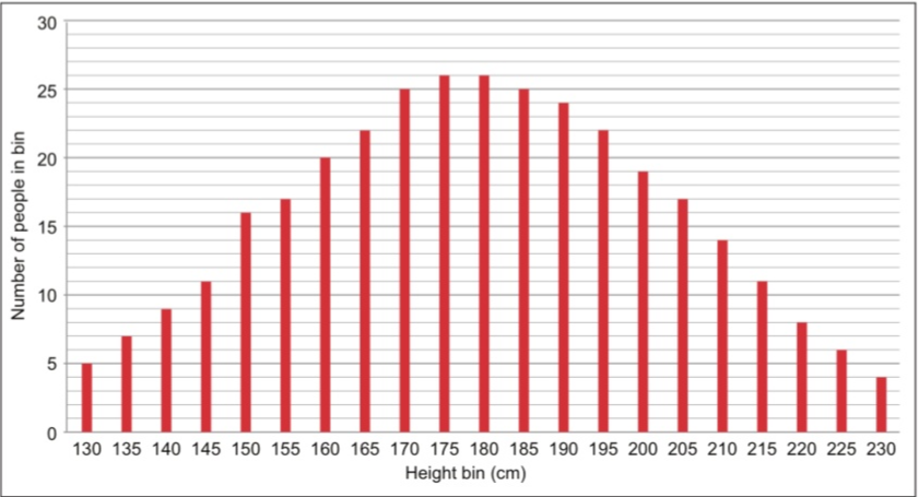 高斯分布也称作正态分布,是我们生活中最常见的概率分布。我们的身高在样本数足够多的情况下就是服从高斯分布的,假设我们统计500个人(随机选取)的身高,并将身高数据绘制成直方图,如下图所示。