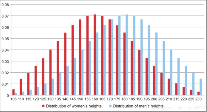 我们可以认为身高数据是由上面这样的高斯分布随机生成的,如果考虑到男女,那么身高数据绘制成的直方图会变成下面这种形式: