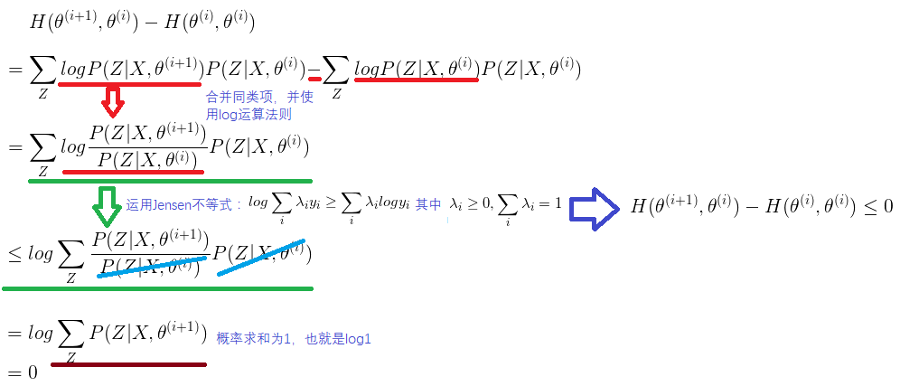 所以就得到了:,这样就证明了每一次迭代比上一次迭代得到的对数似然函数要大,这样EM算法才能收敛。