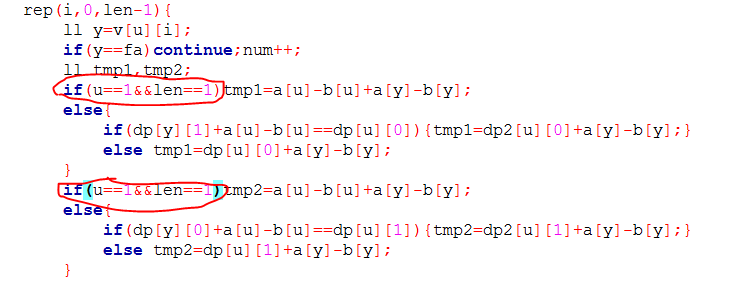 啥时候会没有次大值?中间的点度至少为2,肯定有次大值,叶子当不了爸爸没次大值没事,那么只有一种情况!也就是第一次dfs所固定的根没有次大值!这时候从父亲那边来的值只可能是根的a[i]-b[i],拿来用就完事(亲测有效),虽说还是判有没有次大值看着舒服,所以后面完整代码还是放的判有无次大值