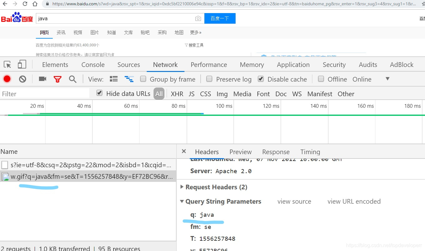 在上图中加了蓝色下划线的地方即为我们在百度当中搜索的字符串内容,可以发现,百度的实现是将搜索的内容当做了http请求的url的参数来处理的,用了一个q作为key,q后面的内容就是所查询的内容。