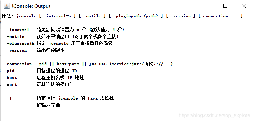 在windows命令窗口执行(当然你得先添加环境变量)jconsole -h 会弹出一个使用说明: