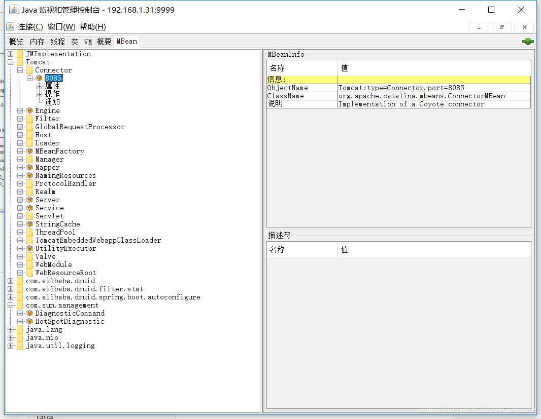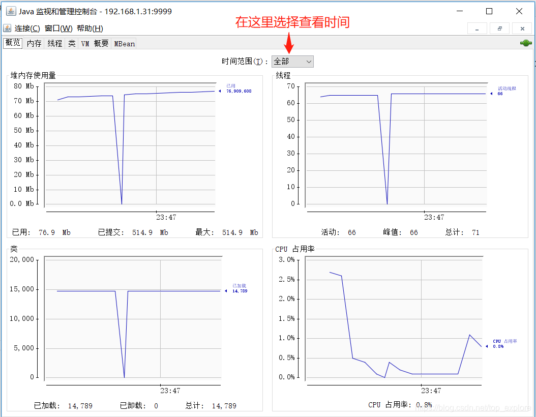 除此之外,jconsole还提供了内存、线程、类、VM概要、Mbean五个标签页,这五个标签页可以帮助我们对项目有着更详细的了解。接下来对每个标签页进行查看:
