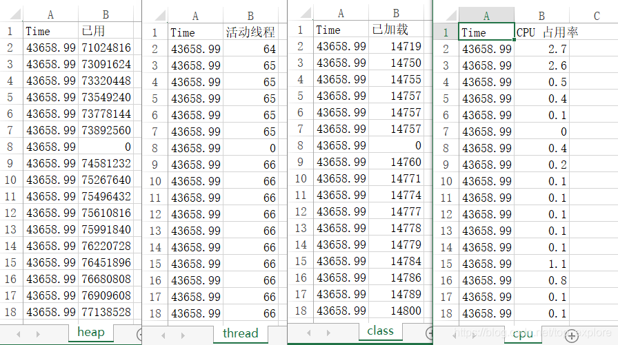 在概览标签页,可以看到堆内存、线程、类、CPU 的走势,可以帮助我们对项目资源使用有个直观的了解。右键走势图,可以选择将数据另存为csv文件,jconsole会把每个时间的数值导出。内容分别是这个样子: