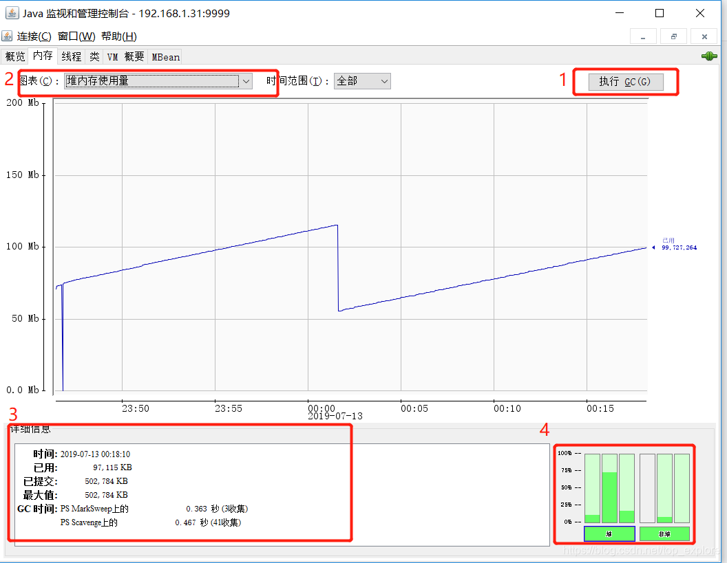 - 最大值:可用于内存管理的最大内存量。它的值可能会改变或未定义。如果Java VM尝试将已使用的内存增加到大于提交的内存,则内存分配可能会失败,即使使用的数量小于或等于最大值(例如,当系统虚拟内存不足时)。