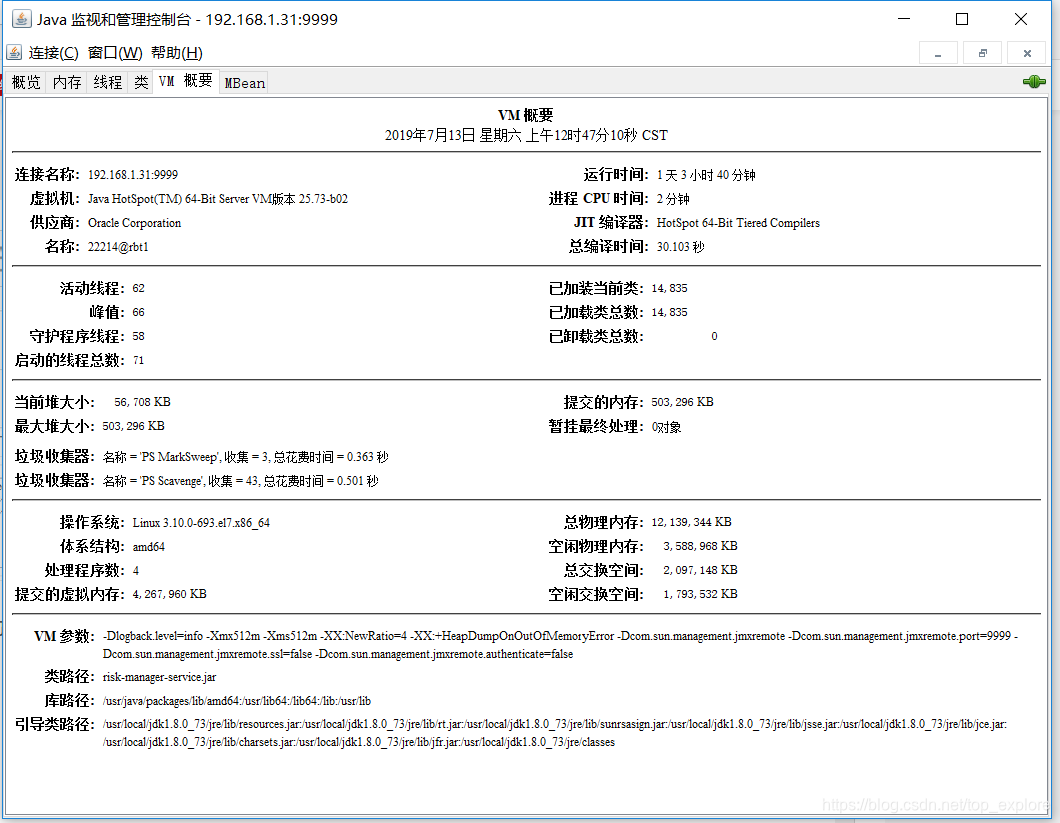 本地进程会在列表里展示,只需要双击便能进入,远程进程需要在远程开启jmx端口,有口令的话输入口令,进入一个进程以后的样子就是这个样子: