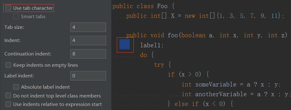 Use tab character不要选,然后indent设置为4,代表按一个tab为4个空格