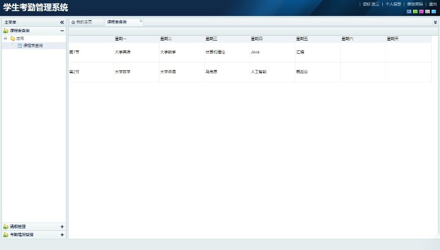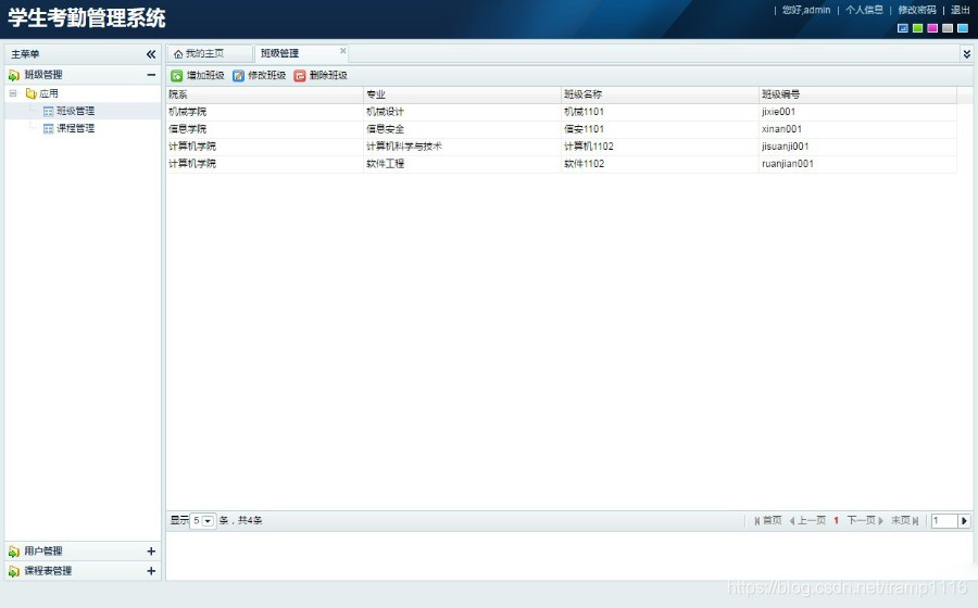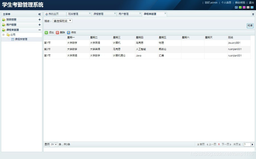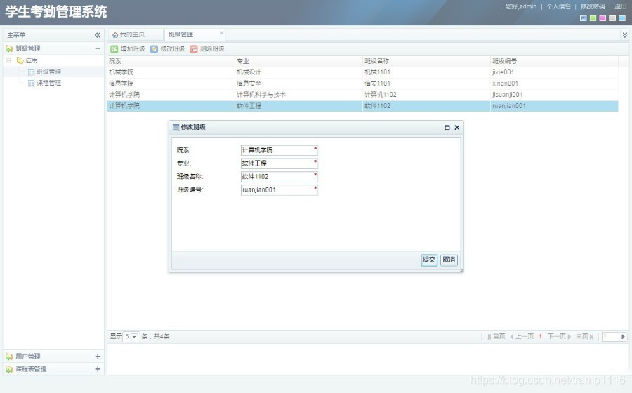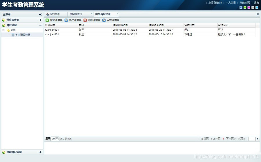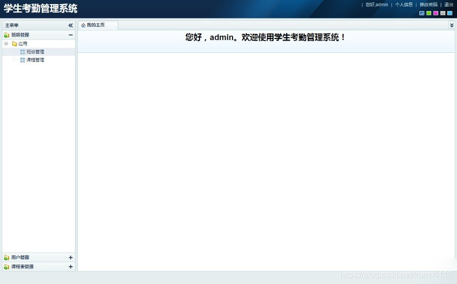 由jsp+ssh+mysql实现的Java web学生考勤管理系统,其中struts版本是struts2。本系统实现了管理员、学生、教师三个角色的功能,其中管理员可以管理基本信息,如班级信息、课程信息、用户信息、课程表等。教师可以管理自己班级的学生的请假信息、考勤信息等。学生可以查看自己的请假信息、考勤信息,提交请假单等。系统内置了物种颜色皮肤,可自由切换,使得系统焕然一新。项目源码和视频指导教程在最下面有获取方式,视频可提前观看,地址是:https://pan.baidu.com/s/1_BQw0baQnL8T0ANtBwd0BA 链接: https://pan.baidu.com/s/1jdJwmyBNmJ8uLNXoNKkJbA 提取码: 86eq