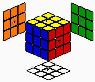 为了处理方便,每一个魔方格我们总是从前面来看它,从而上、下、左、右、前、后对于每一个魔方格而言都是确定的位置。