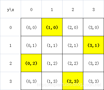 轴向有x,y,z,但每层的旋转只涉及到两个轴向,有(x,y)、(y,z)、(x,z),尽管魔方格看上去很多的,但坐标的转换却都遵循非常简单的变换规律,以4阶的 (x,y) 坐标转换为例,如下,黄色为同一个坐标旋转变换的值: