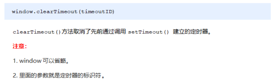 <button>点击停止定时器</button><script>var btn = document.querySelector('button');// 开启定时器var timer = setTimeout(function() {console.log('爆炸了');}, 5000);// 给按钮注册单击事件btn.addEventListener('click', function() {// 停止定时器clearTimeout(timer);})</script>