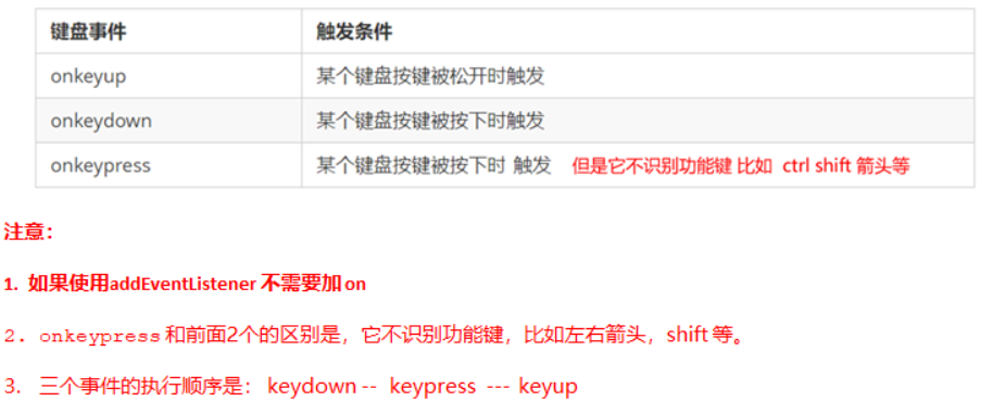 <script>// 常用的键盘事件//1. keyup 按键弹起的时候触发 document.addEventListener('keyup', function() {console.log('我弹起了');})//3. keypress 按键按下的时候触发 不能识别功能键 比如 ctrl shift 左右箭头啊document.addEventListener('keypress', function() {console.log('我按下了press');})//2. keydown 按键按下的时候触发 能识别功能键 比如 ctrl shift 左右箭头啊document.addEventListener('keydown', function() {console.log('我按下了down');})// 4. 三个事件的执行顺序 keydown -- keypress -- keyup</script>