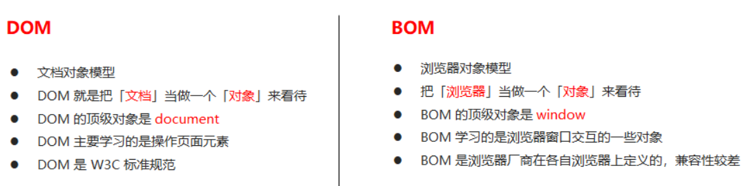 BOM 缺乏标准,JavaScript 语法的标准化组织是 ECMA,DOM 的标准化组织是 W3C,BOM 最初是Netscape 浏览器标准的一部分。