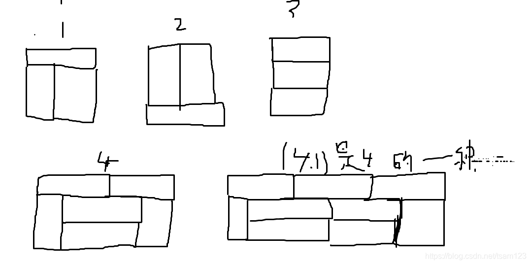 第一种情况就是 分为 i-2 列图形 和一个 2列的图形,方法数就是 i-2 列方法数就是f[i-2] ,这个2 列的方法数就是 3了,所以此时的方法数就是f[i-2]*3; 这个就相当于 将一个复杂的图形化简单了,为什么这样想呢?在一个 i-2列图形 的后面 加上2列的这个图形,就会变成 i 列的。 (就相当于拆开了,计算更加简单),这种情况的 fn1=f[i-2]*3;