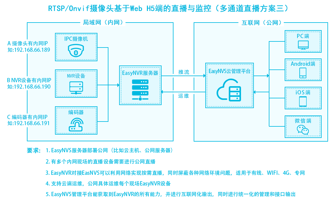 EasyNVR是一款拥有完整、自主、可控知识产权,同时又能够具备软硬一体功能的安防互联网化流媒体服务器,能够通过简单的网络摄像机通道配置,将传统监控行业里面的高清网络摄像机IP Camera、NVR等具有RTSP、Onvif协议输出的设备接入到EasyNVR,EasyNVR能够将这些视频源的音视频数据进行拉取,转换为RTMP/HLS,进行全平台终端H5直播(Web、Android、iOS),并且EasyNVR能够将视频源的直播数据对接到第三方CDN网络,实现互联网级别的直播分发。
