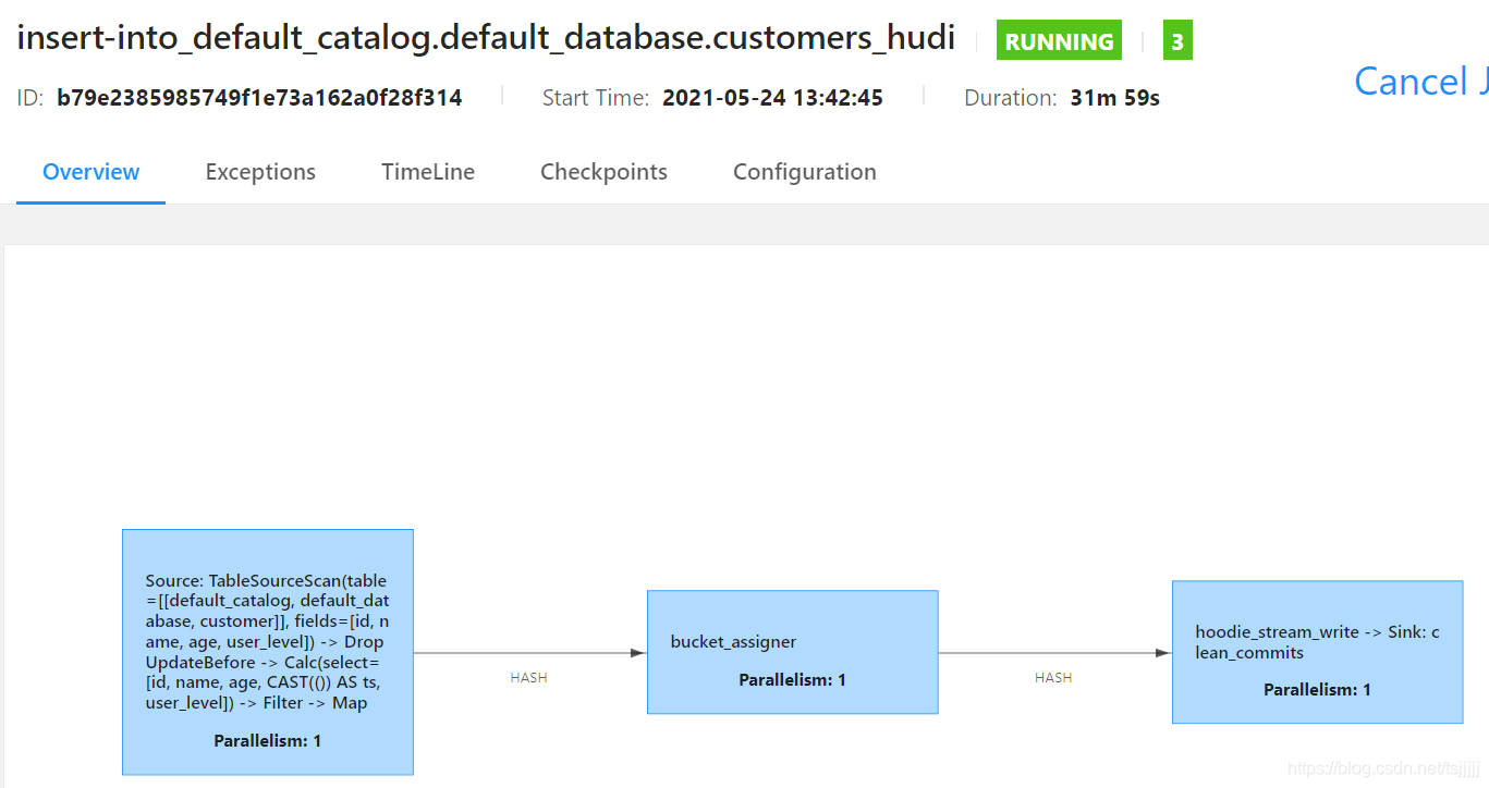 // do sql query tableEnv.executeSql(create_kafka_table_sql) tableEnv.executeSql(create_hudi_table_sql) tableEnv.executeSql("insert into customers_hudi (id, name, age, ts, user_level) select id, name, age, current_timestamp, user_level from customer")