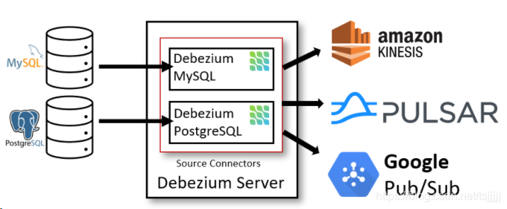此方式使用的是Debezium自带的Source Connector。数据库端的事件会被序列化为JSON或Apache Avro格式,然后发送到其他消息系统如Kinesis、Apache Pulsar等。