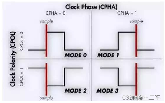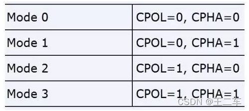 CPOL和CPHA,分别都可以是0或时1,对应的四种组合就是: