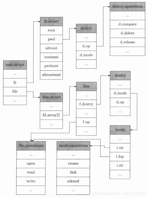 struct file_operations {struct module *owner;loff_t (*llseek) (struct file *, loff_t, int);ssize_t (*read) (struct file *, char __user *, size_t, loff_t *);ssize_t (*write) (struct file *, const char __user *, size_t, loff_t *);ssize_t (*read_iter) (struct kiocb *, struct iov_iter *);ssize_t (*write_iter) (struct kiocb *, struct iov_iter *);int (*iterate) (struct file *, struct dir_context *);unsigned int (*poll) (struct file *, struct poll_table_struct *);long (*unlocked_ioctl) (struct file *, unsigned int, unsigned long);long (*compat_ioctl) (struct file *, unsigned int, unsigned long);int (*mmap) (struct file *, struct vm_area_struct *);int (*mremap)(struct file *, struct vm_area_struct *);int (*open) (struct inode *, struct file *);int (*flush) (struct file *, fl_owner_t id);int (*release) (struct inode *, struct file *);int (*fsync) (struct file *, loff_t, loff_t, int datasync);int (*aio_fsync) (struct kiocb *, int datasync);int (*fasync) (int, struct file *, int);int (*lock) (struct file *, int, struct file_lock *);ssize_t (*sendpage) (struct file *, struct page *, int, size_t, loff_t *, int);unsigned long (*get_unmapped_area)(struct file *, unsigned long, unsigned long, unsigned long, unsigned long);int (*check_flags)(int);int (*flock) (struct file *, int, struct file_lock *);ssize_t (*splice_write)(struct pipe_inode_info *, struct file *, loff_t *, size_t, unsigned int);ssize_t (*splice_read)(struct file *, loff_t *, struct pipe_inode_info *, size_t, unsigned int);int (*setlease)(struct file *, long, struct file_lock **, void **);long (*fallocate)(struct file *file, int mode, loff_t offset,loff_t len);void (*show_fdinfo)(struct seq_file *m, struct file *f);
