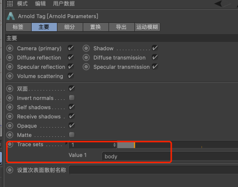追踪集Trace set 这个需要设置组,在想排除的物体上添加阿诺德标签,如下方示意,增加了一个body。