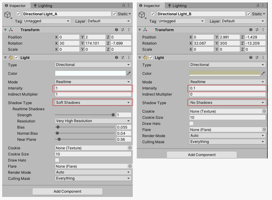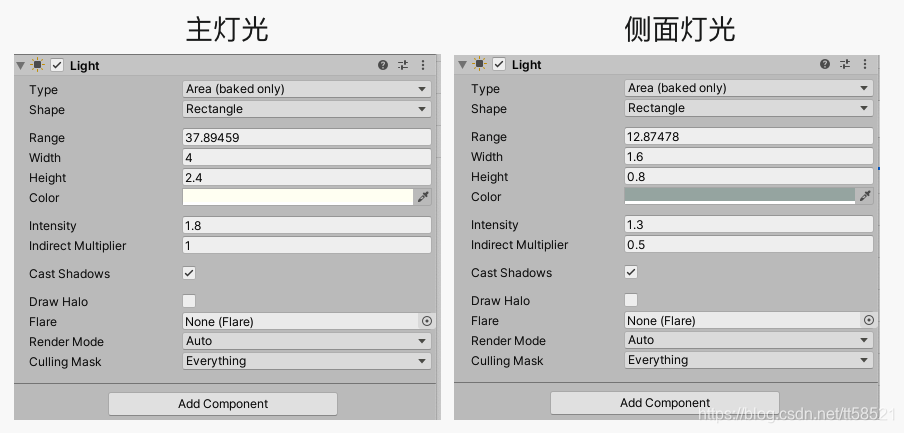 intensity:这个是灯光的强度,一般这个值不会太大,一般默认值1,在这个案例中,用了两个Directional Light,主灯光为白色,强度值为1,辅光为0.1,颜色偏黄一点,具体参数对比看下图: