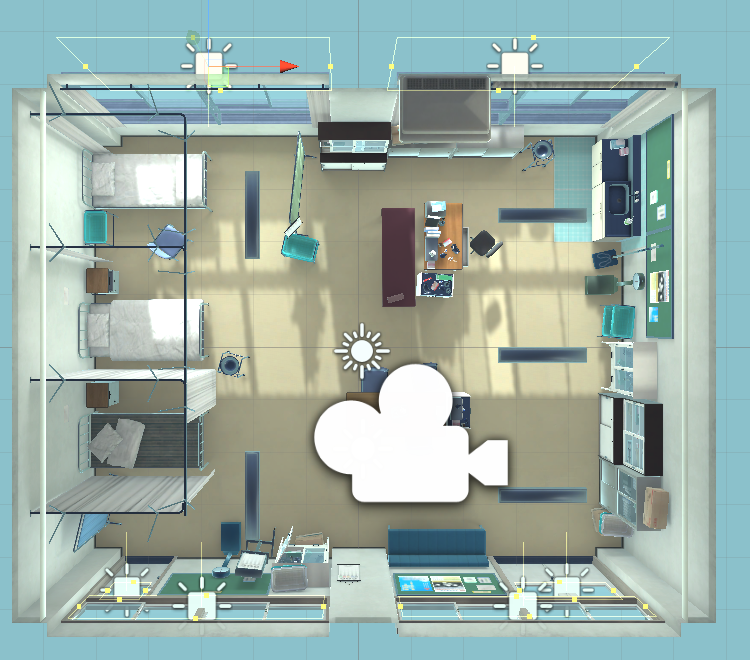 3、area ligh,区域光,本场景中区域光有五处,有两处是放在主灯光射进来的窗户外(上方),有三处是放在对面阴影窗户外(下方),有主有次
