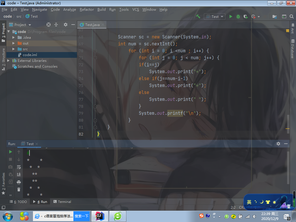 import java.util.Scanner;public class Test {public static void main(String[] args) {Scanner sc = new Scanner(System.in);int num = sc.nextInt();for (int i = 0; i <num ; i++) {for (int j = 0; j < num; j++) {if(i==j)System.out.print("*");else if(j==num-i-1)System.out.print("*");elseSystem.out.print(" ");}System.out.printf("\n");}}