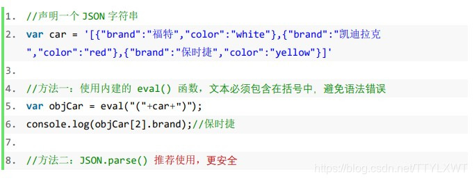 下面的例子为两种 JSON 字符串转 javascript 对象的方法;推荐使用 JSON.parse()