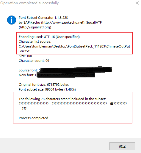 然后,第一个坑来了,这两个软件使用时都需要设置“需要保留的文字”内容,前者放到一个文件里面,后者将中文和其它字符分别放到两个文件里面。这一步,不知道有没有同学遇到中文生成不了的情况,反正我是遇到了,前一个软件显示的生成文件里面没有中文字符,后者干脆就直接报错,显示JAVA无法解压字库文件,等等错误。如下图,第二个红框,实际上该精简字库中的中文字符是没有生成成功的。这个坑的主要原因在刚才那个“需要保留文字”的文件中,见第一个红框,这个文本文件要求要用UTF-16编码保存,而Window10 默认建立的中文文本是 GB2312的。
