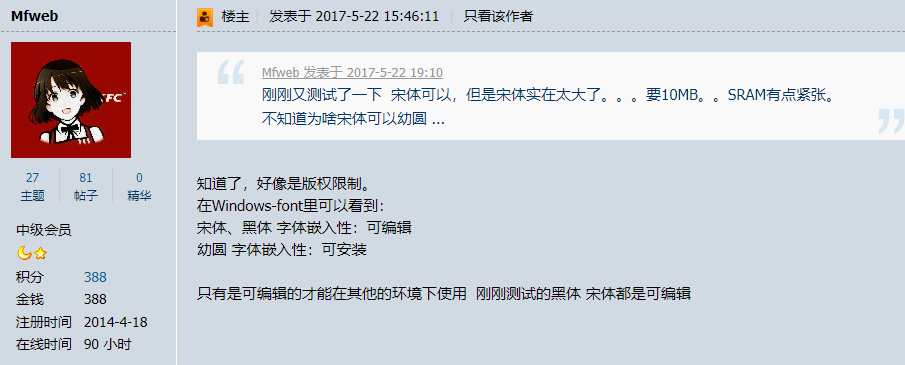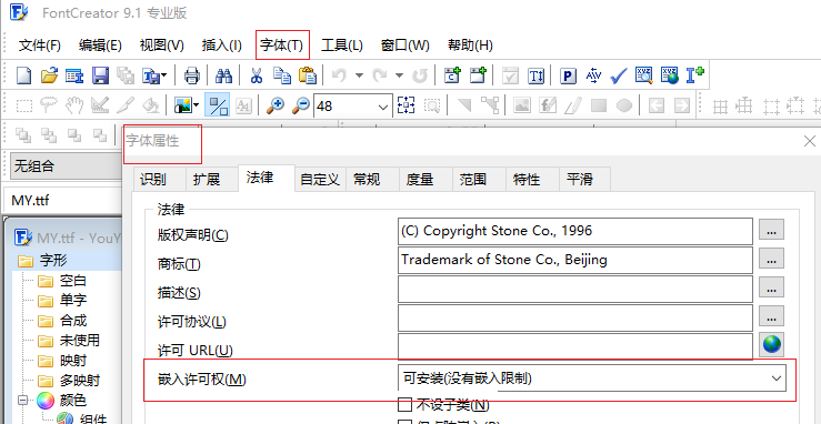 踏过这个坑后,你生成的TTF文件已经基本上能够放到emWin里面去显示了,但是如果多测试几个字体文件你会发现,有的可以显示,有的还是显示不出来。什么情况呢?!偶然翻看原子哥的论坛发现,这个可能和版权有关。用于精简操作的源字库文件的,"字体嵌入性选项"必须是:可编辑状态。