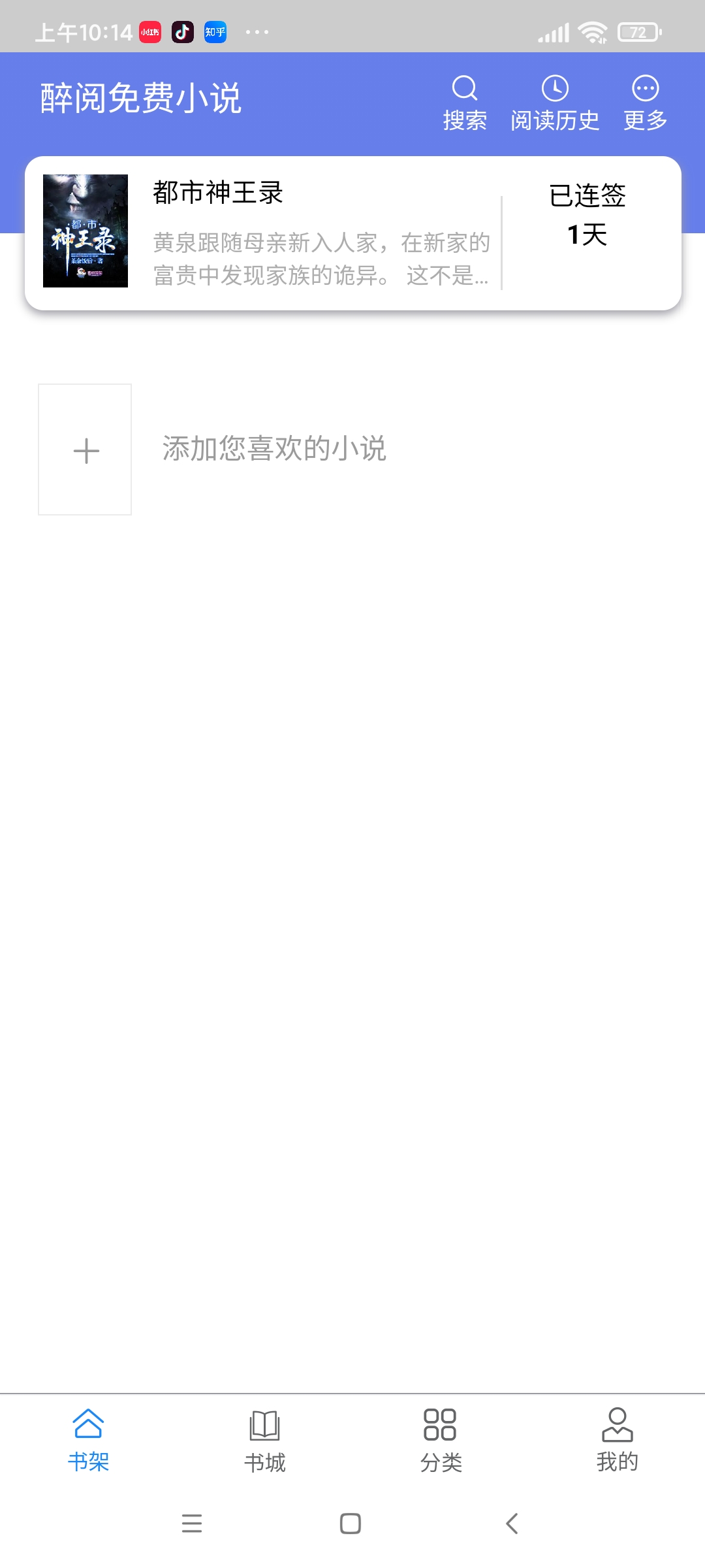 - 书架:添加您喜好的小说、签到、搜索书籍、阅读历史、更多(管理书架)