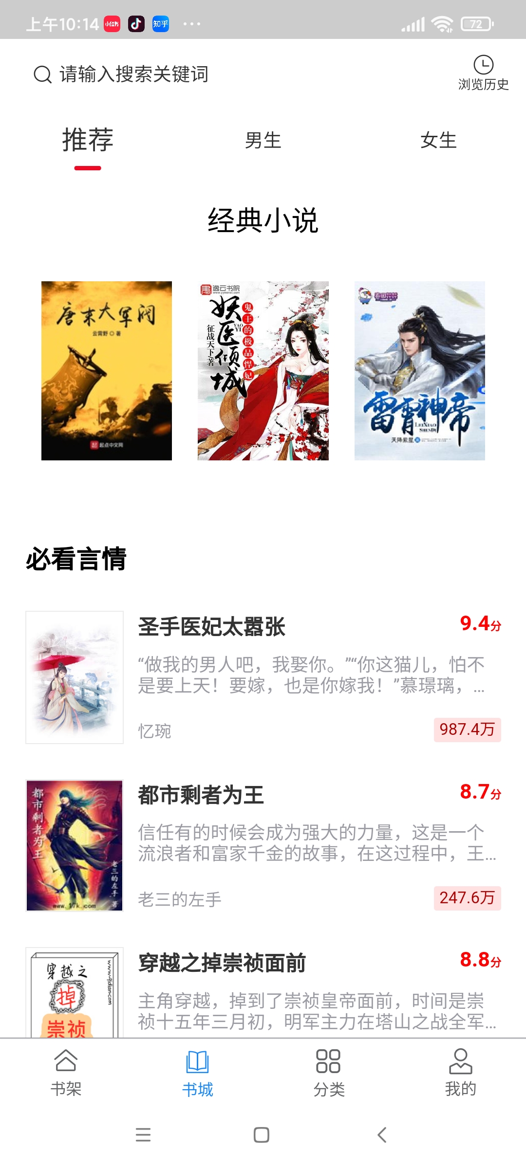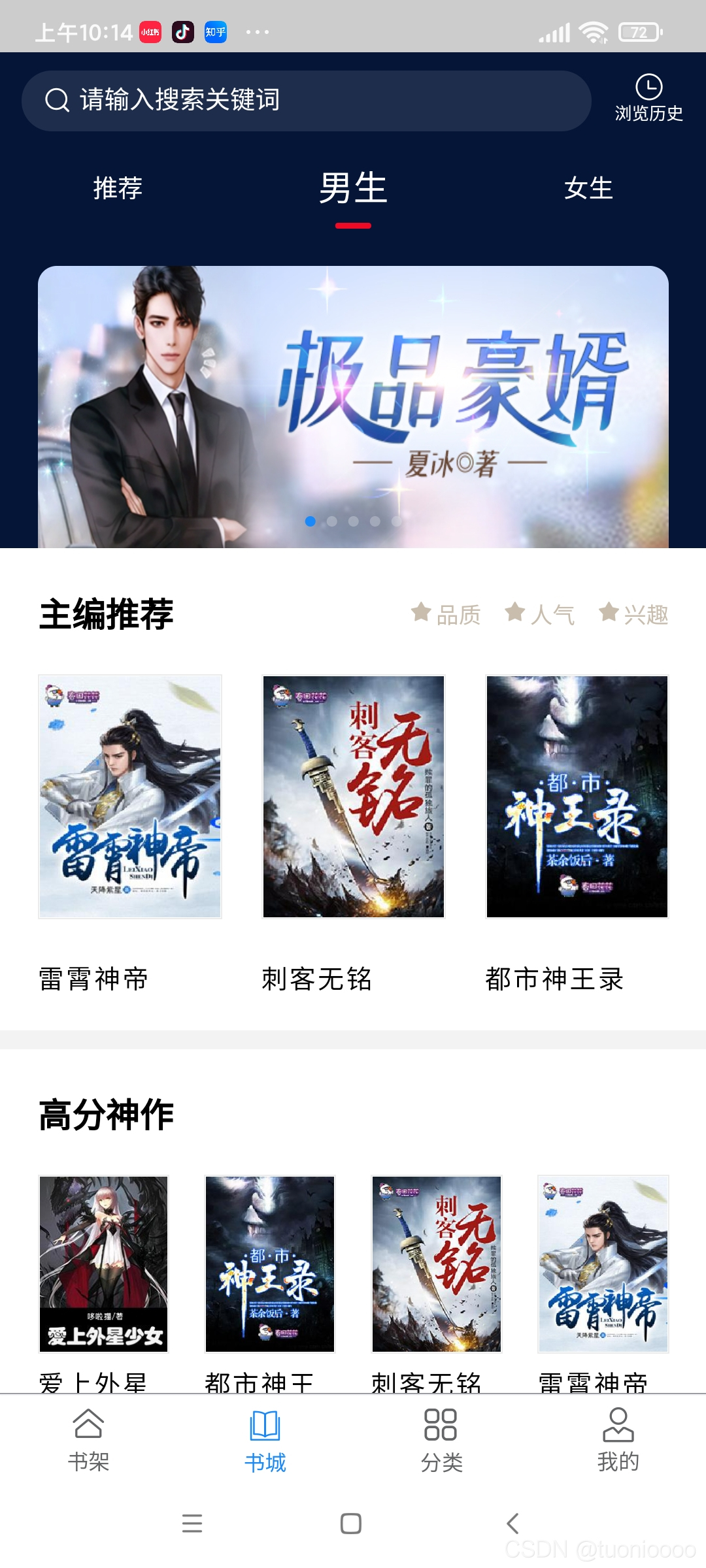 - 书城:NavHeader搜索 轮播图、推荐列表、男生列表、女生列表