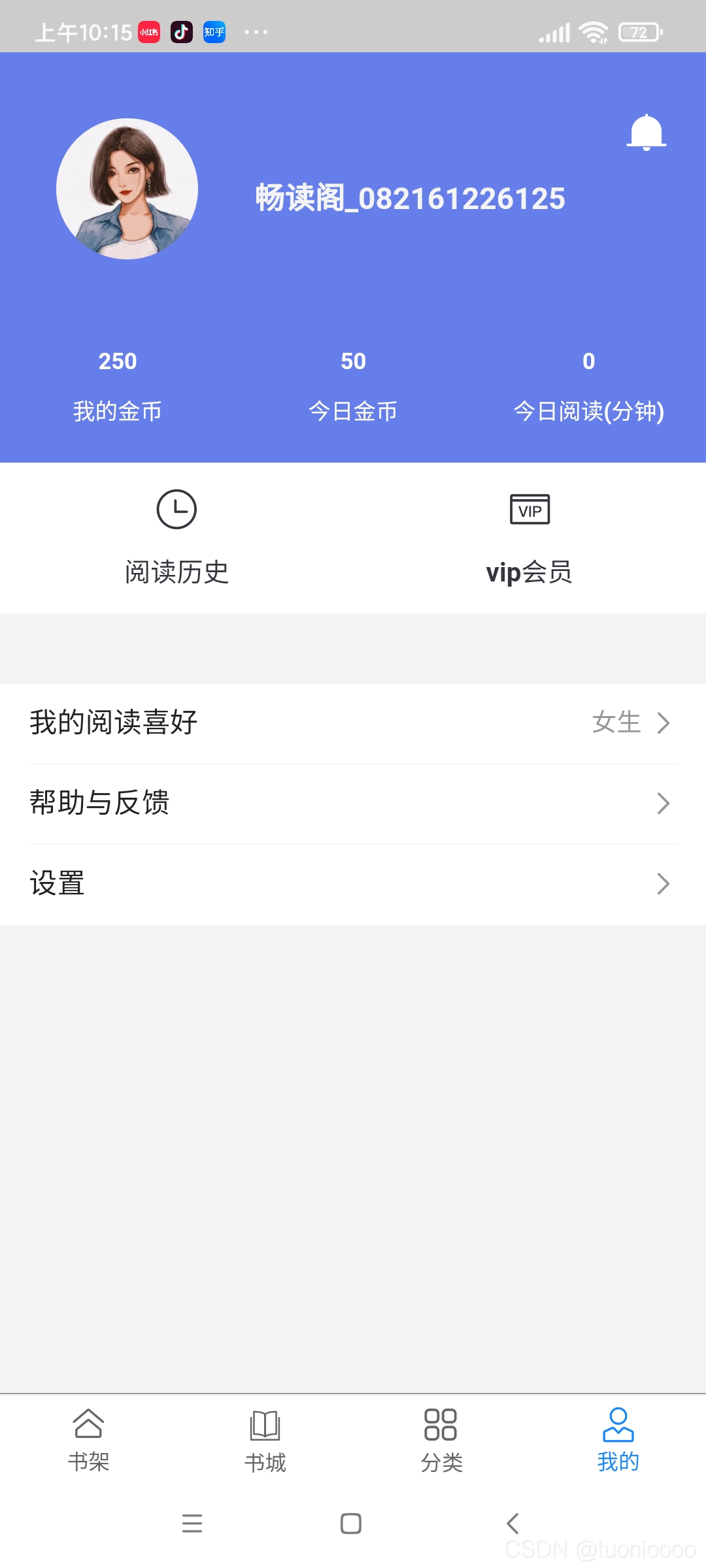 - 我的页面:头像、昵称、基本信息设置、反馈功能、阅读喜好、阅读历史、消息通知、退出功能、我的金币统计