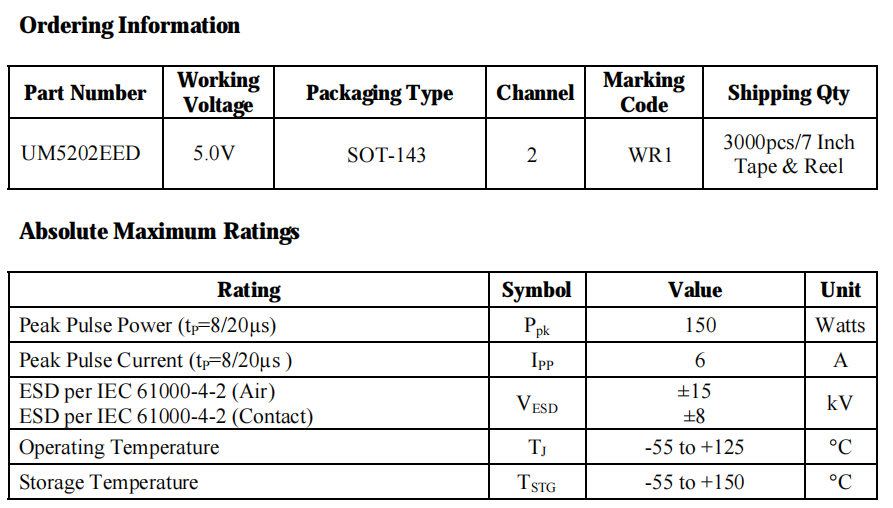 这篇关于UM5202EEDFSOT-143工作电压5V用于高速线路保护的2线ESD保护二极管阵列管UM5202EEDF USB端口和以太网端口保护TVS二极管阵列,低泄漏电流和箝位电压25V结电容1PF的文章就介绍到这儿,希望我们推荐的文章对编程师们有所帮助!