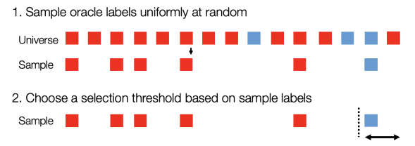 为了校正采样中的随机性,我们使用置信区间来限制失败的可能性。回到之前的相同示例,我们将用如下图所示的方式在样本中绘制经验阈值。但是,这一次我们不只是简单地返回超过该经验阈值的记录,而是在整个数据集中构建一个60%召回率的置信区间。