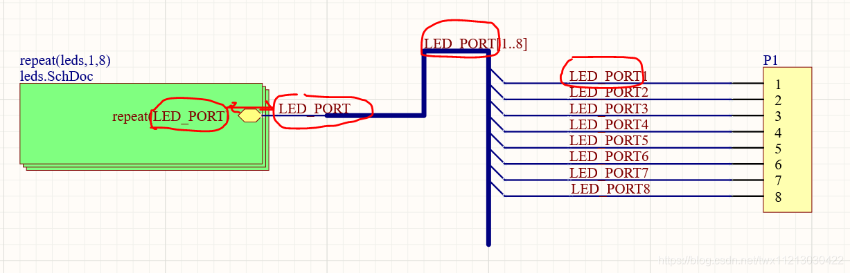总线标号需要与port端口号名称一致,Sheet Entry引脚的线需要添加网络标号这个标号与Sheet Entry名称一致。而总线的其他分支前缀就是Sheet Entry名称。如下图所示: