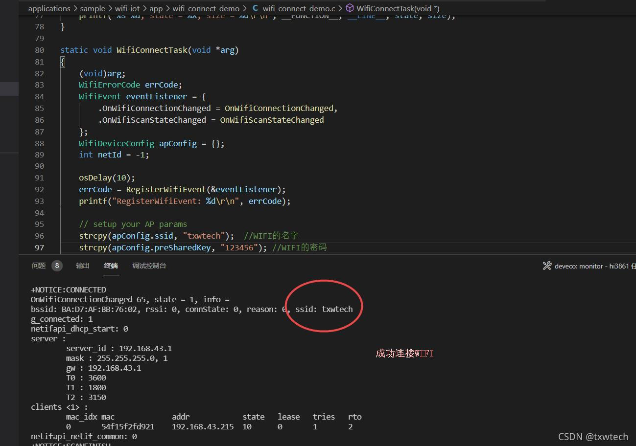 {(void)arg;WifiErrorCode errCode;WifiEvent eventListener = {.OnWifiConnectionChanged = OnWifiConnectionChanged,.OnWifiScanStateChanged = OnWifiScanStateChanged};WifiDeviceConfig apConfig = {};int netId = -1;osDelay(10);errCode = RegisterWifiEvent(&eventListener);printf("RegisterWifiEvent: %d\r\n", errCode);// setup your AP paramsstrcpy(apConfig.ssid, "txwtech"); //WIFI的名字strcpy(apConfig.preSharedKey, "123456"); //WIFI的密码apConfig.securityType = WIFI_SEC_TYPE_PSK;while (1) {errCode = EnableWifi();printf("EnableWifi: %d\r\n", errCode);osDelay(10);errCode = AddDeviceConfig(&apConfig, &netId);printf("AddDeviceConfig: %d\r\n", errCode);g_connected = 0;errCode = ConnectTo(netId);printf("ConnectTo(%d): %d\r\n", netId, errCode);while (!g_connected) {osDelay(10);}printf("g_connected: %d\r\n", g_connected);osDelay(50);// 联网业务开始struct netif* iface = netifapi_netif_find("wlan0");if (iface) {err_t ret = netifapi_dhcp_start(iface);printf("netifapi_dhcp_start: %d\r\n", ret);osDelay(200); // wait DHCP server give me IPret = netifapi_netif_common(iface, dhcp_clients_info_show, NULL);printf("netifapi_netif_common: %d\r\n", ret);}// 模拟一段时间的联网业务int timeout = 60;while (timeout--) {osDelay(100);printf("after %d seconds, I'll disconnect WiFi!\n", timeout);}// 联网业务结束err_t ret = netifapi_dhcp_stop(iface);printf("netifapi_dhcp_stop: %d\r\n", ret);Disconnect(); // disconnect with your APRemoveDevice(netId); // remove AP configerrCode = DisableWifi();printf("DisableWifi: %d\r\n", errCode);osDelay(200);}