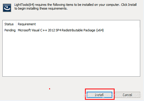 step 3 在弹出的对话框中,缺少VC++ 2012 SP4的安装包,点击Install按钮该依赖包
