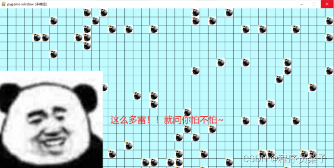 VictoryRate=0class Sweep(object):"""docstring for Sweep"""def __init__(self):# 初始化一个页面self.Screen = pygame.display.set_mode(Screen_Size)# 字体self.myfont = pygame.font.SysFont('幼圆', 25)# 格子大小self.gwide = int(Screen_Size[0] / Colums)self.gheight = int(Screen_Size[1] / Rows)self.board = np.zeros((Rows, Colums))# 存储下一步可选的位置self.NBS = []# NBS辅助容器,用于判断NBS有没变化self.NBSTool = []# 判断是否进行概率选择扫雷self.GO = False# 遍历存储容器self.container = []# 标注地雷存储容器self.mineContainer = []# 实际地雷位置存储容器self.Mines = []# 数字存储容器self.numbers = []# 加载图片self.LoadImg()# 画格子self.DrawGrid()# 埋雷self.HideMines()def LoadImg(self):# 加载地雷图片self.mine = pygame.image.load('image/mine.jpg').convert_alpha()self.mine = pygame.transform.scale(self.mine, (self.gwide, self.gheight))# 加载旗子图片self.flag = pygame.image.load('image/flag.jpg').convert_alpha()self.flag = pygame.transform.scale(self.flag, (self.gwide, self.gheight))# 加载地雷爆炸图片self.boom = pygame.image.load('image/boom.png').convert_alpha()self.boom = pygame.transform.scale(self.boom, (self.gwide, self.gheight))# 加载数字图片self.num1 =