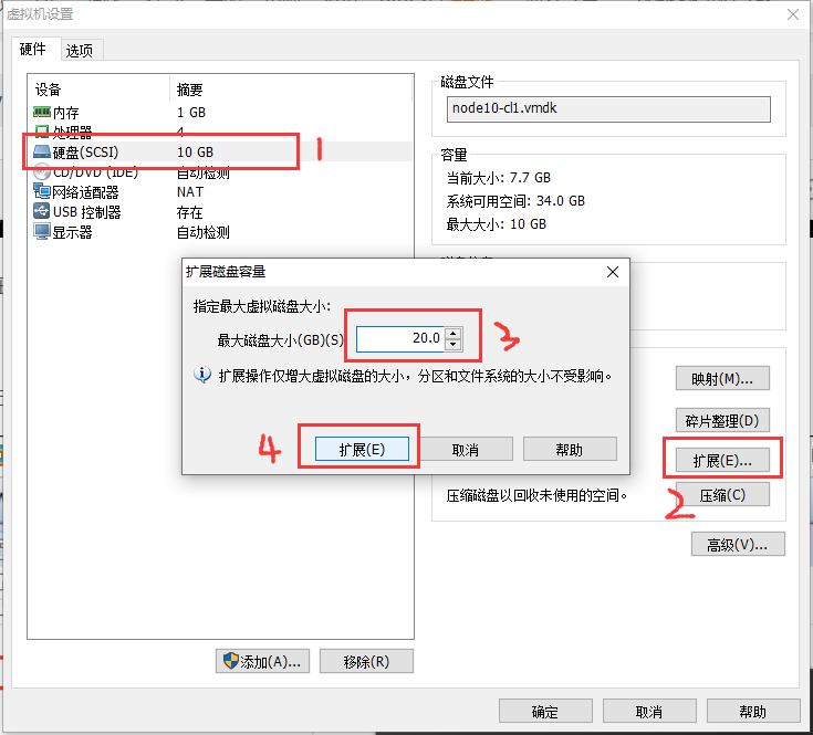 对原有磁盘大小进行设置,从 10GB 编辑为 20,点击扩展按钮。