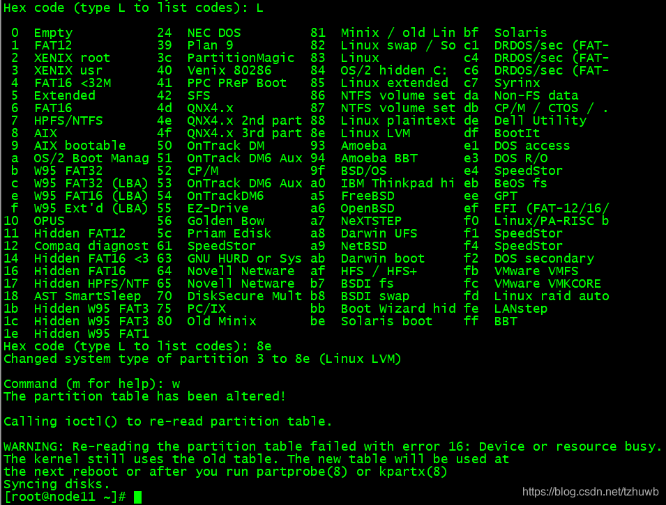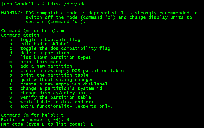 可以看到 /dev/sda3 的 Id号为 83,我们要将其改成 8e(LVM卷文件系统的 Id),具体方法同第五步,如下图所示: