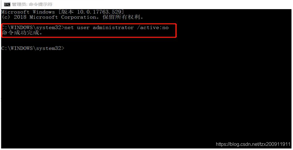 2.输入Administrator账户关闭指令net user administrator/active:no后按
